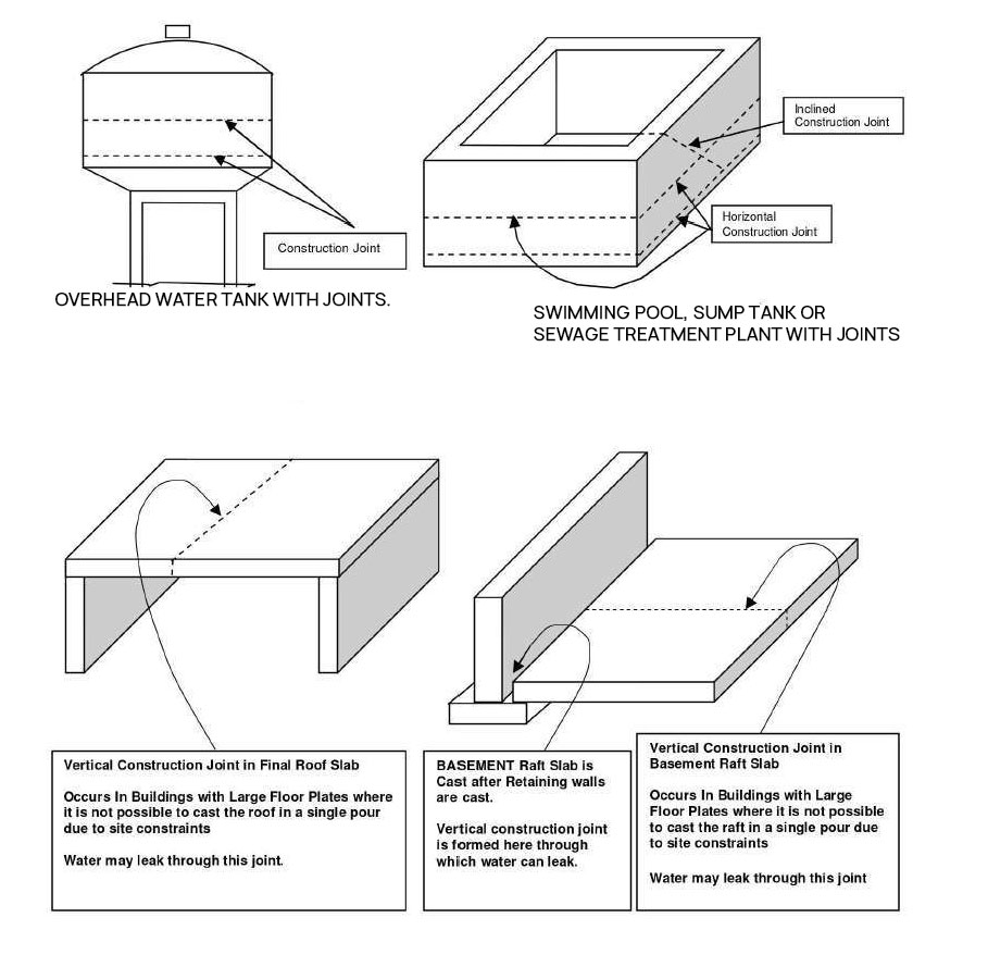 A typical problem in most Water Retaining Structures is the leakage of water through Construction and Cold Joints. A construction joint is formed when concrete is cast in different stages successively. These joints may be horizontal, vertical, inclined or curved depending on how the concrete is cast.