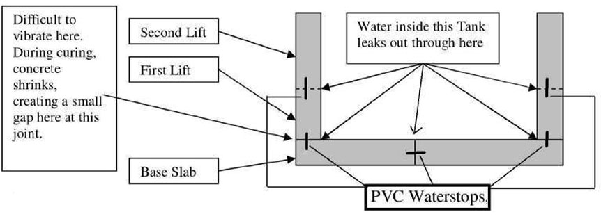 Generally, after the base slab is cast when the first lift of concrete is being placed for the wall of the water retaining structure, it is very difficult to vibrate at the bottom of the lift (floor and wall joint). Water then leaks through this open joint
